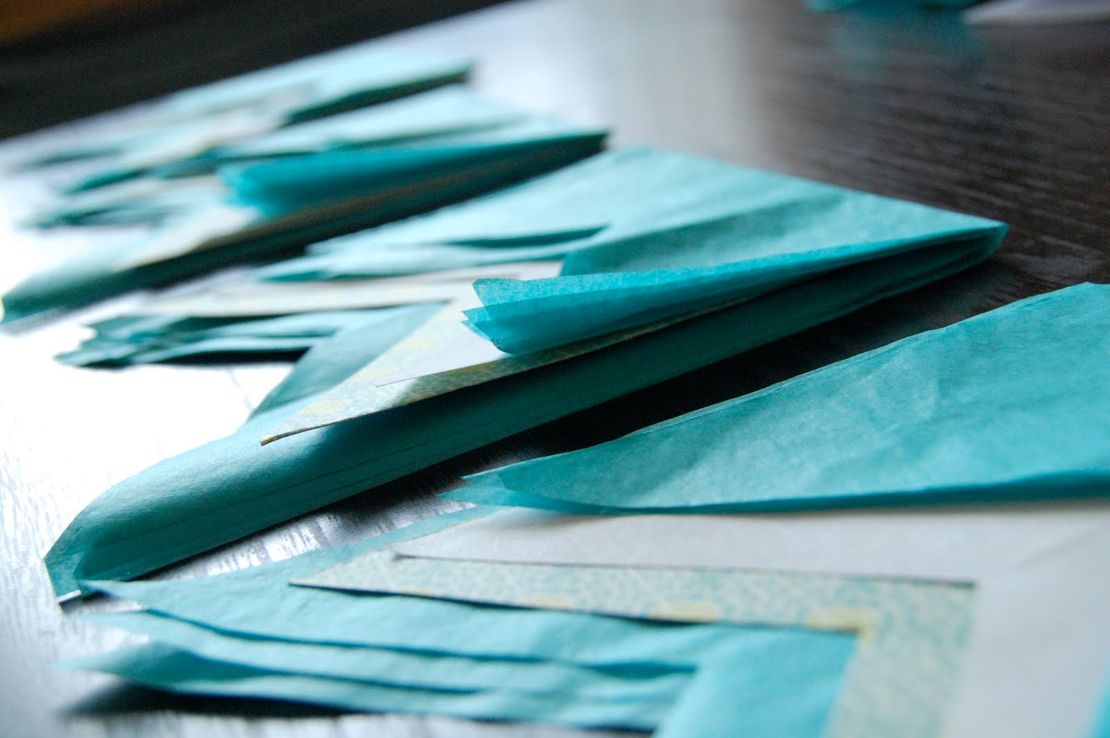 Start cutting tiny vertical strips of fringe in 1 inch cuts. I cut the tissue layers at once, then cut the papers each separately so all your fringe doesn't end up looking the same.